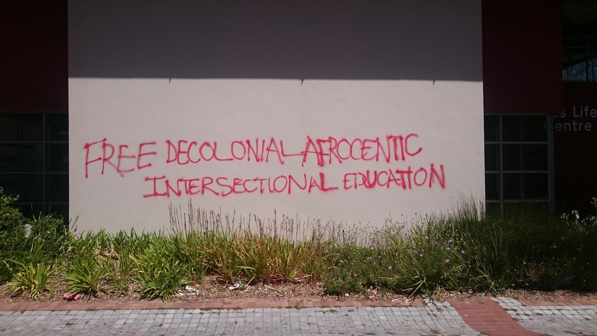 Mielenosoittajien jälkiä University of Western Capen kampuksella. “Vapaus kolonialisminjälkeisestä, syrjivästä koulutuksesta”